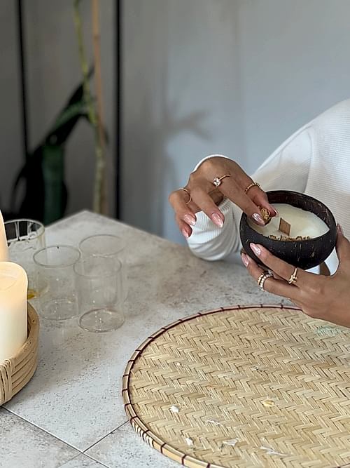 Mum sadece bir atmosfer yaratmak için kullanılmaz. Aynı zamanda huzur ve rahatlama sağlar. %100 Doğal coconut kaseler içerisine %100 soya wax ile doldurup üzerine dekorlamalarımızı yapacağız.